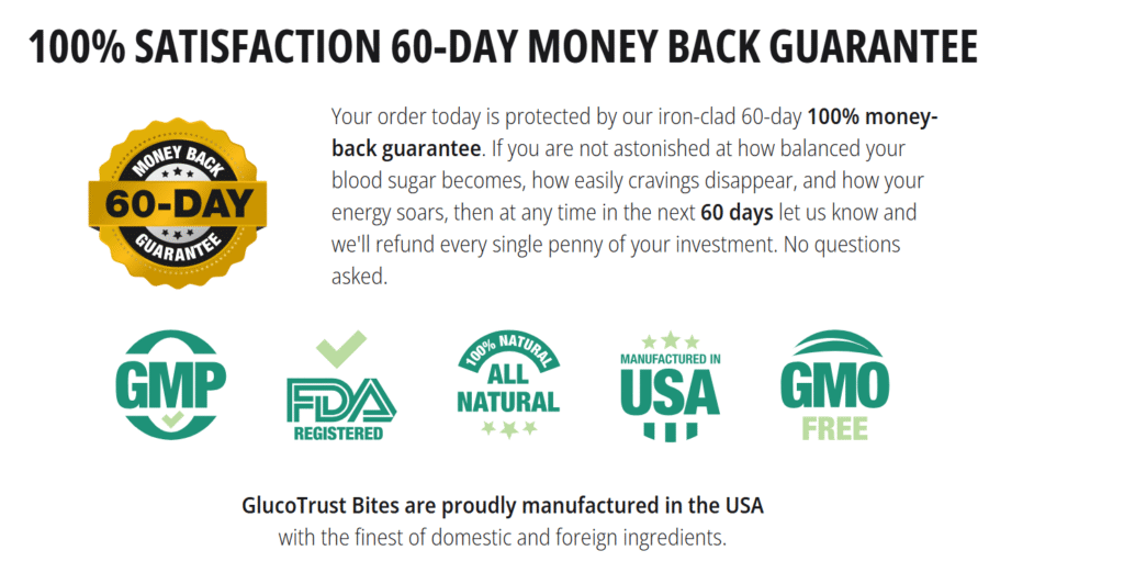 • Transparency and Trust: With a potent, disclosed blend of ingredients, a GMP-certified facility in the USA, and a rock-solid 60-day money-back guarantee, GlucoTrust Bites operates with a level of transparency that is rare in the industry.